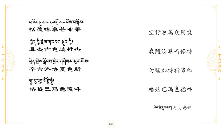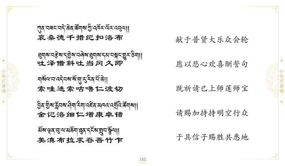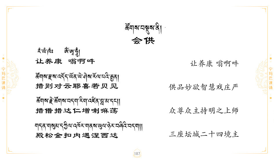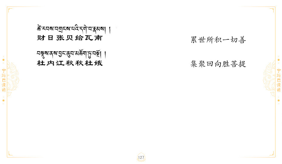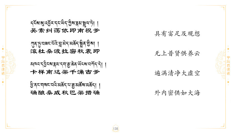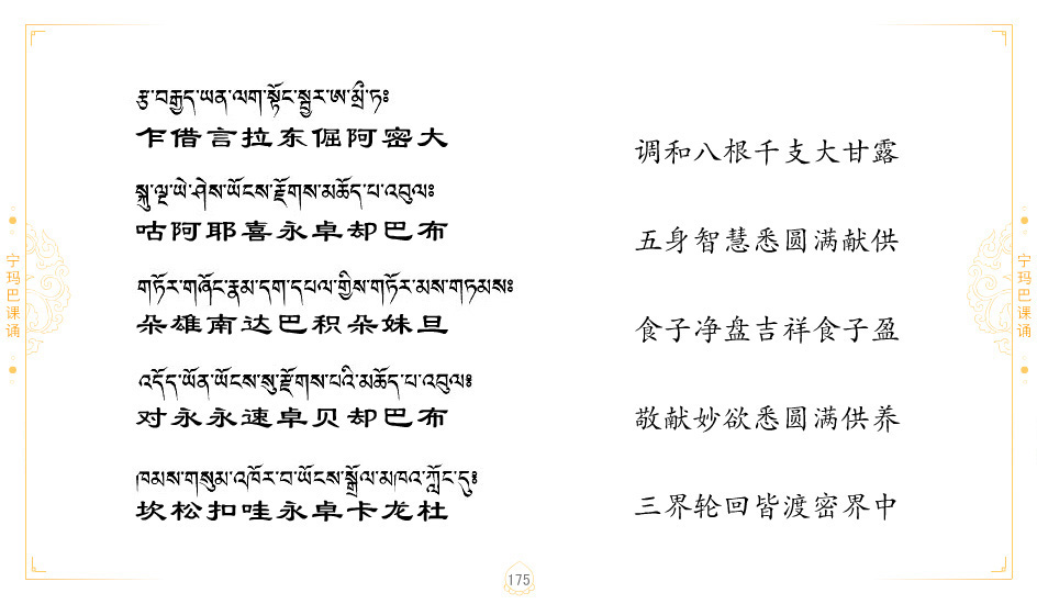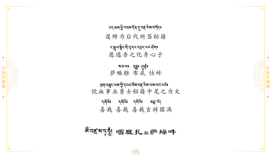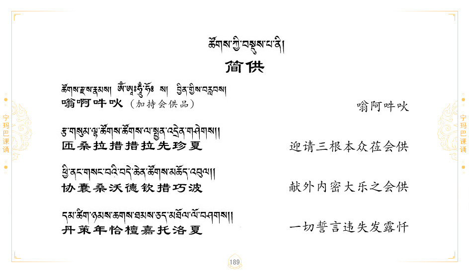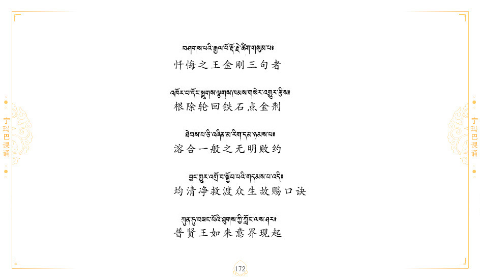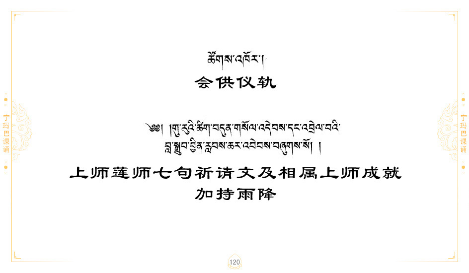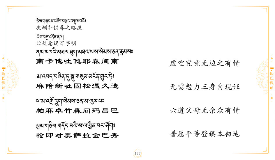 藏 01.加持_p1藏 02.加持_p1藏 03.八圣吉祥颂_p2藏 04.供养仪轨_p6藏 05.普贤行愿品(七支品)_p8藏 06.发心仪轨_p12藏 07.摄受祈祷文 _p17藏 08.文殊礼赞_p20藏 09.文殊开智偈_p21藏 10.请法偈_p22藏 11.回向偈_p22藏 12.普贤行愿品_p23藏 13.成就所愿誓言与咒_p40藏 14.前行的修法_p41藏 15.皈依的修法_p48藏 16.发菩提心_p48藏 17.金刚萨垛诵修法_p49藏 18.曼達拉的修法.p54藏 19.上师瑜珈的修法_p62藏 20.金刚七句祈请文_p75藏 21.意乐成就祈请文_p76藏 22.意乐疾速成就祈请颂_p92藏 23.祷文四句_p95藏 24.往生铜色吉祥愿文_p96藏 25.普获悉地祈祷文_p97藏 26.遣除道障祈祷文_p98藏 27.金刚盔恺修持仪轨_p99藏 28.多个加持咒_p100藏 29.圣号与明咒_p101藏 30.如来真言_p111藏 31.菩萨真言_p118藏 32.金刚真言_p122藏 33.佛母真言_p127藏 34.护法真言_p135藏 35.财神真言_p138藏 36.生活瑜珈_p140藏 37.黄财神修法仪轨_p146藏 39.地藏王菩萨修持仪轨_p149藏 41.前译教法兴盛之愿文_p154藏 42.麦彭仁波切极乐愿文_p159藏 43.文殊大圆满愿文_p161藏 44.吉祥偈_p169藏 45.法王住世祈祷文_p171藏 46.降阳龙朵加参祈祷文_p172藏 47.愿海精髓_p174藏 48.贺耶智私那塔著的密乘简便烧施_p177藏 49.精华会供-金刚萨垛修法仪轨-发愿者-会供-简供-回向吉祥偈_p179-185藏 54.礼赞甘一赞颂王续_p186藏 55.阿弥陀佛修法极乐捷径_p201藏 56.极乐愿文_p205藏 57.大圆满心髓破瓦法_p255藏 58.龙萨破瓦_p255藏 60.前行念诵仪轨_p269藏 62.寂怒百尊修持_p289藏 63.供格萨尔王护法神仪轨_p293藏 64.一髻佛母等护法略修仪轨_p293藏 65.传承上师祈请文_p306藏 66.大圆满莲师荟供仪轨_p311藏 67.调伏情器智慧莲师忿怒修法_p304藏 68.金刚手修持_p345藏 69.供灯仪轨_p347藏 70.荟供仪轨(上师成就加持雨降)_p06藏 73.药师佛_p385藏 74.顺息解脱密法(大圆满虹光)_p06藏 75.普贤王如来祈祷能显自然智根本愿文_p396藏 76.释迦牟尼佛_修法仪轨_p409藏 77.古萨里修法_p417藏 78.火施仪轨(回向魔崇部多)_p420藏 79.法王上师相应法_p429藏 80.上师祈请颂_p434藏 81.真实名经归纳七句_p435藏 82.无垢忏悔续_p436