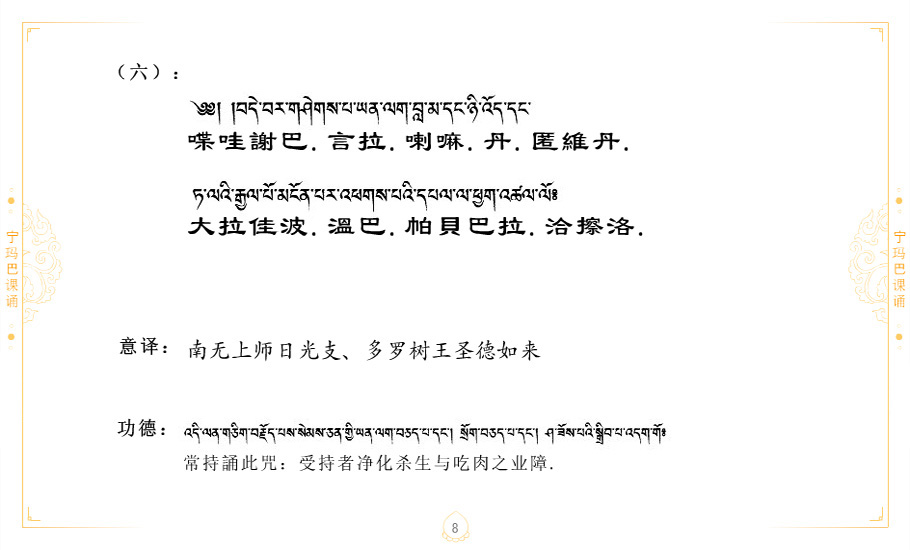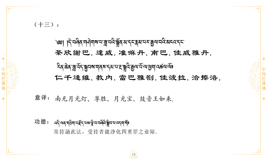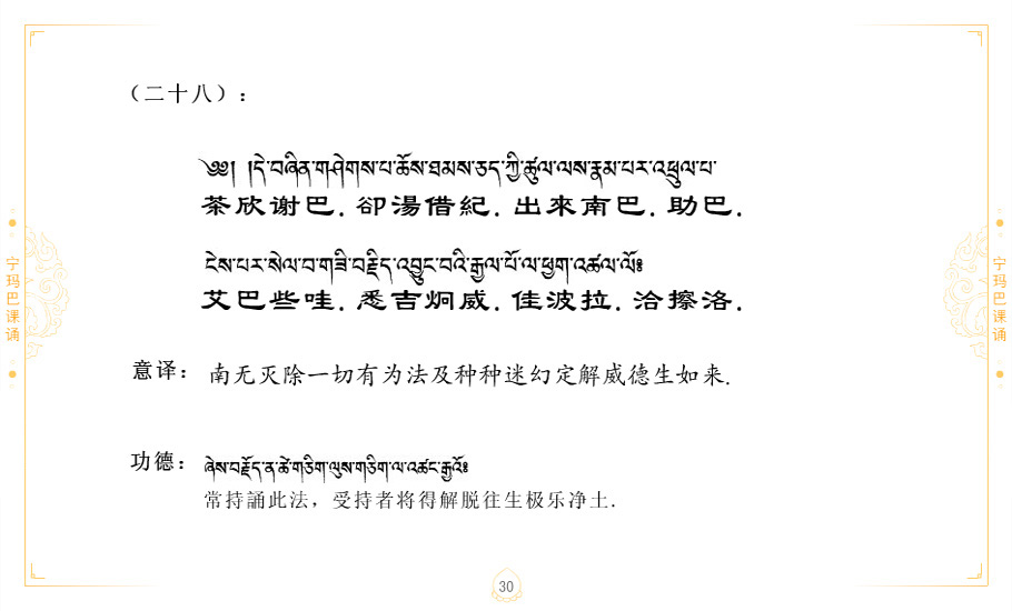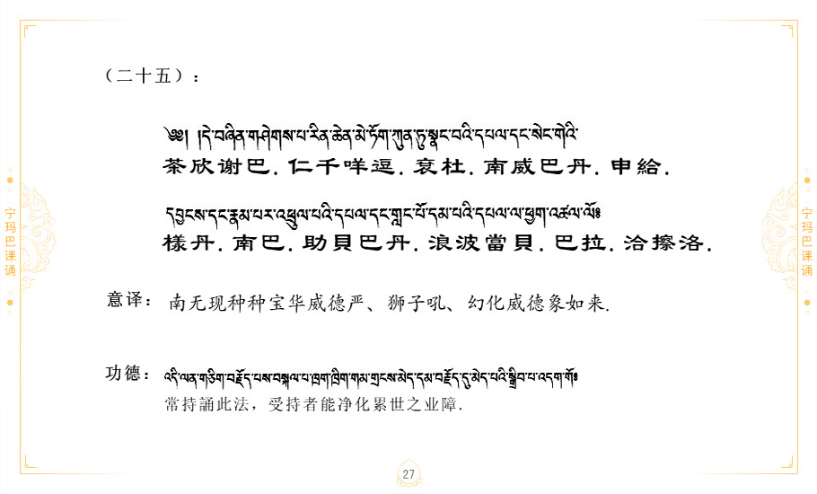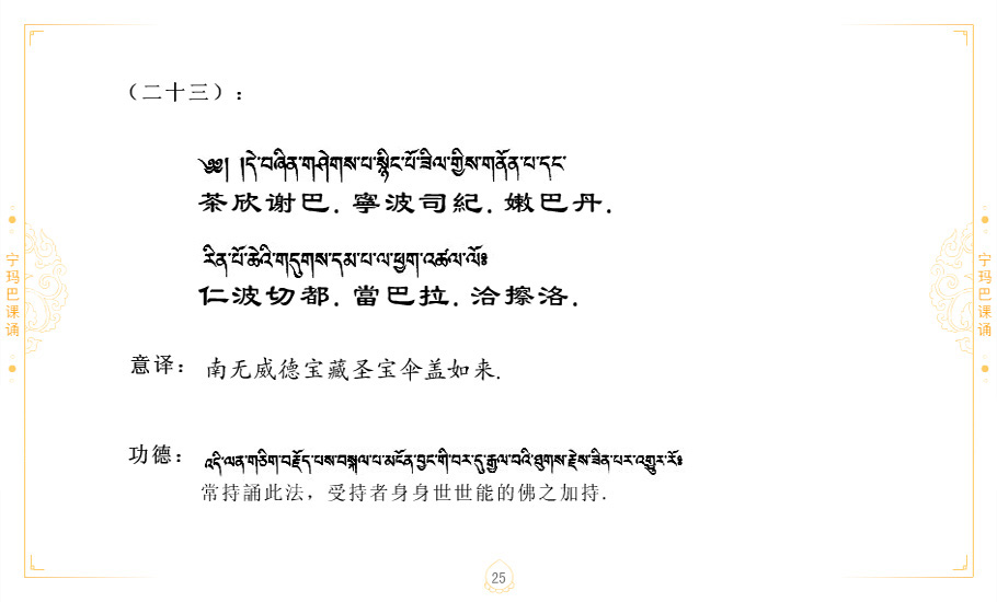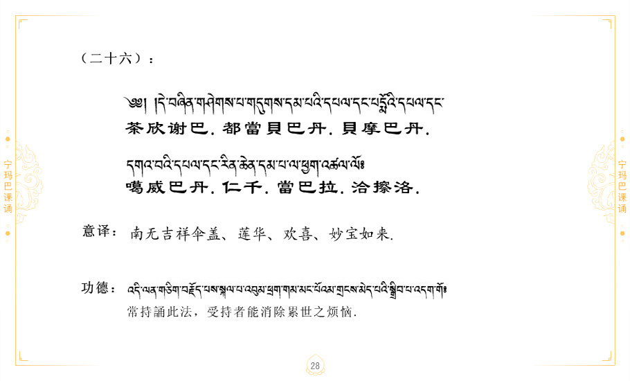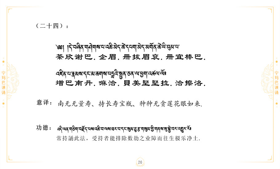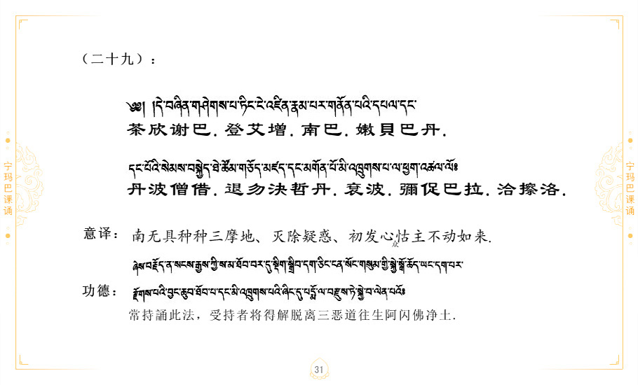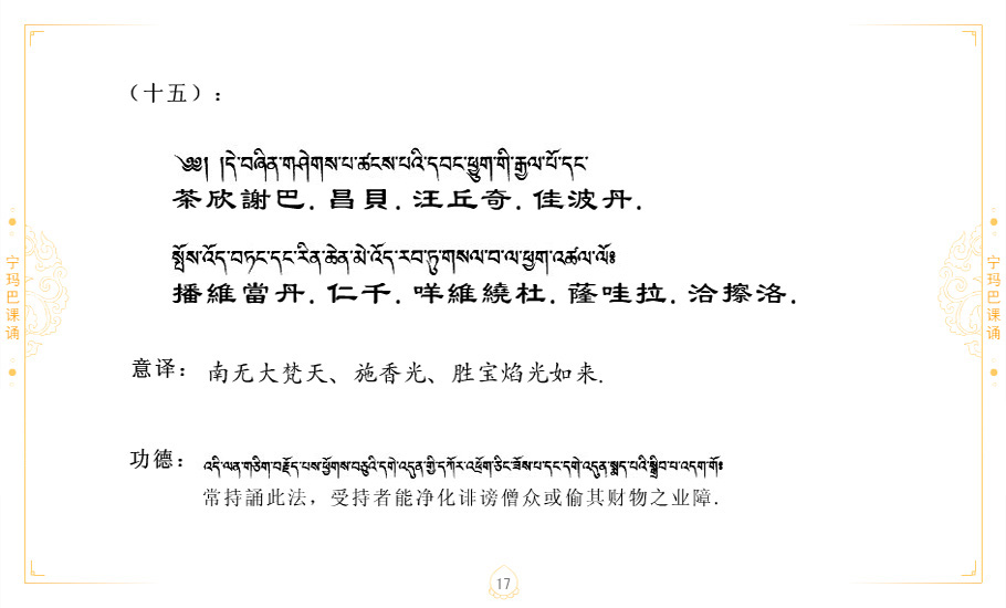 藏 01.加持_p1藏 02.加持_p1藏 03.八圣吉祥颂_p2藏 04.供养仪轨_p6藏 05.普贤行愿品(七支品)_p8藏 06.发心仪轨_p12藏 07.摄受祈祷文 _p17藏 08.文殊礼赞_p20藏 09.文殊开智偈_p21藏 10.请法偈_p22藏 11.回向偈_p22藏 12.普贤行愿品_p23藏 13.成就所愿誓言与咒_p40藏 14.前行的修法_p41藏 15.皈依的修法_p48藏 16.发菩提心_p48藏 17.金刚萨垛诵修法_p49藏 18.曼達拉的修法.p54藏 19.上师瑜珈的修法_p62藏 20.金刚七句祈请文_p75藏 21.意乐成就祈请文_p76藏 22.意乐疾速成就祈请颂_p92藏 23.祷文四句_p95藏 24.往生铜色吉祥愿文_p96藏 25.普获悉地祈祷文_p97藏 26.遣除道障祈祷文_p98藏 27.金刚盔恺修持仪轨_p99藏 28.多个加持咒_p100藏 29.圣号与明咒_p101藏 30.如来真言_p111藏 31.菩萨真言_p118藏 32.金刚真言_p122藏 33.佛母真言_p127藏 34.护法真言_p135藏 35.财神真言_p138藏 36.生活瑜珈_p140藏 37.黄财神修法仪轨_p146藏 39.地藏王菩萨修持仪轨_p149藏 41.前译教法兴盛之愿文_p154藏 42.麦彭仁波切极乐愿文_p159藏 43.文殊大圆满愿文_p161藏 44.吉祥偈_p169藏 45.法王住世祈祷文_p171藏 46.降阳龙朵加参祈祷文_p172藏 47.愿海精髓_p174藏 48.贺耶智私那塔著的密乘简便烧施_p177藏 49.精华会供-金刚萨垛修法仪轨-发愿者-会供-简供-回向吉祥偈_p179-185藏 54.礼赞甘一赞颂王续_p186藏 55.阿弥陀佛修法极乐捷径_p201藏 56.极乐愿文_p205藏 57.大圆满心髓破瓦法_p255藏 58.龙萨破瓦_p255藏 60.前行念诵仪轨_p269藏 62.寂怒百尊修持_p289藏 63.供格萨尔王护法神仪轨_p293藏 64.一髻佛母等护法略修仪轨_p293藏 65.传承上师祈请文_p306藏 66.大圆满莲师荟供仪轨_p311藏 67.调伏情器智慧莲师忿怒修法_p304藏 68.金刚手修持_p345藏 69.供灯仪轨_p347藏 70.荟供仪轨(上师成就加持雨降)_p06藏 73.药师佛_p385藏 74.顺息解脱密法(大圆满虹光)_p06藏 75.普贤王如来祈祷能显自然智根本愿文_p396藏 76.释迦牟尼佛_修法仪轨_p409藏 77.古萨里修法_p417藏 78.火施仪轨(回向魔崇部多)_p420藏 79.法王上师相应法_p429藏 80.上师祈请颂_p434藏 81.真实名经归纳七句_p435藏 82.无垢忏悔续_p436